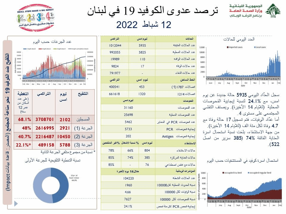 أعلنت وزارة الصحة العامة في تقريرها اليومي تسجيل 5935 إصابة جديدة بفيروس كورونا رفعت العدد التراكمي للحالات المثبتة الى 1012044، كما تم تسجيل 17 حالة وفاة ".