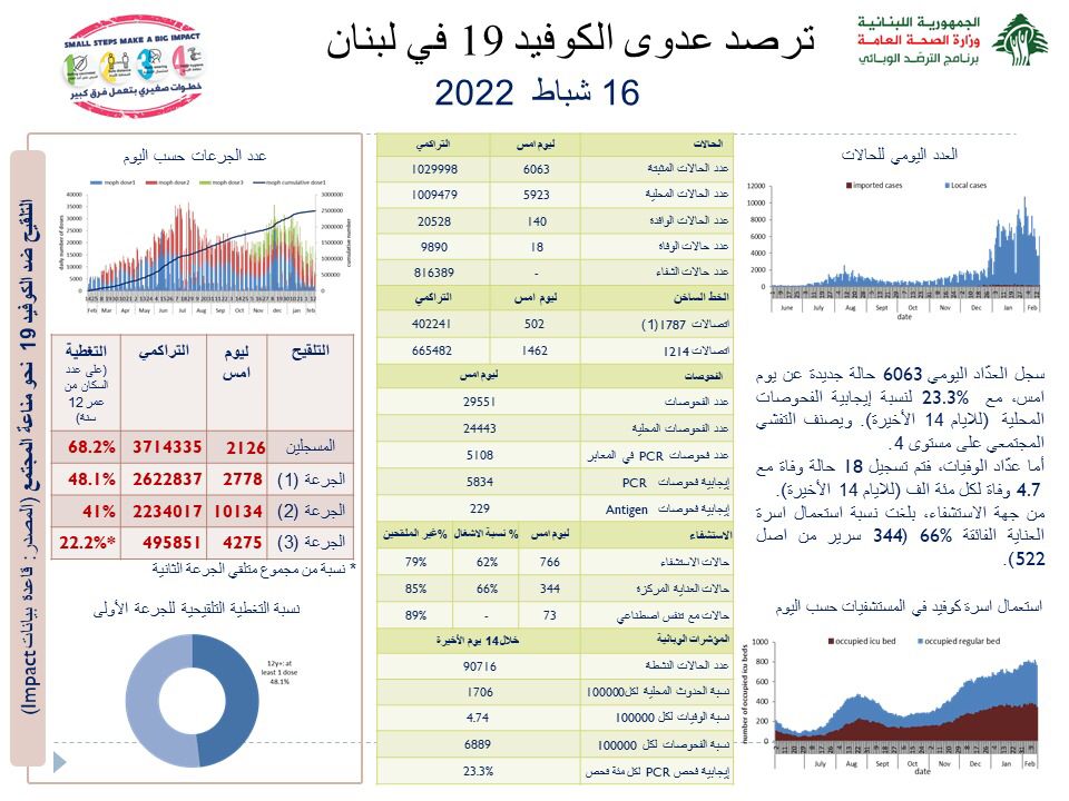 أعلنت وزارة الصحة العامة عن تسجيل 6063 إصابة جديدة بفيروس كورونا ليرتفع العدد التراكمي للإصابات منذ بدء انتشار الوباء إلى 1029998.