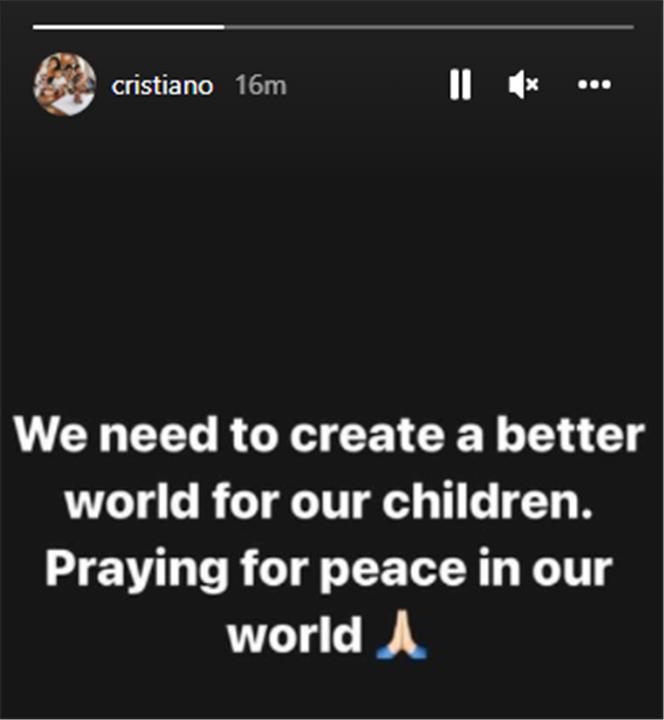 وكتب رونالدو عبر حسابه الشخصي بموقع إنستجرام: "نحتاج إلى خلق عالم أفضل لأطفالنا، أصلي من أجل السلام في عالمنا".