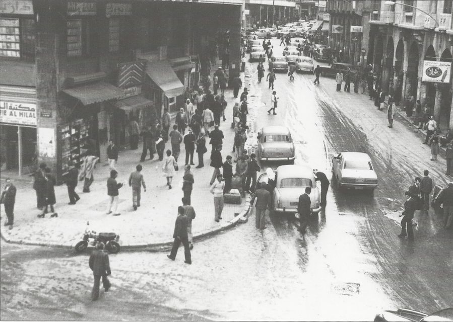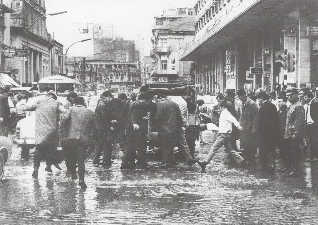 مواطنون يعبرون شارع الأمير بشير وسط سيول الأمطار وازدحام السير أمام مبنى العازارية باتجاه ساحة البرج 1970