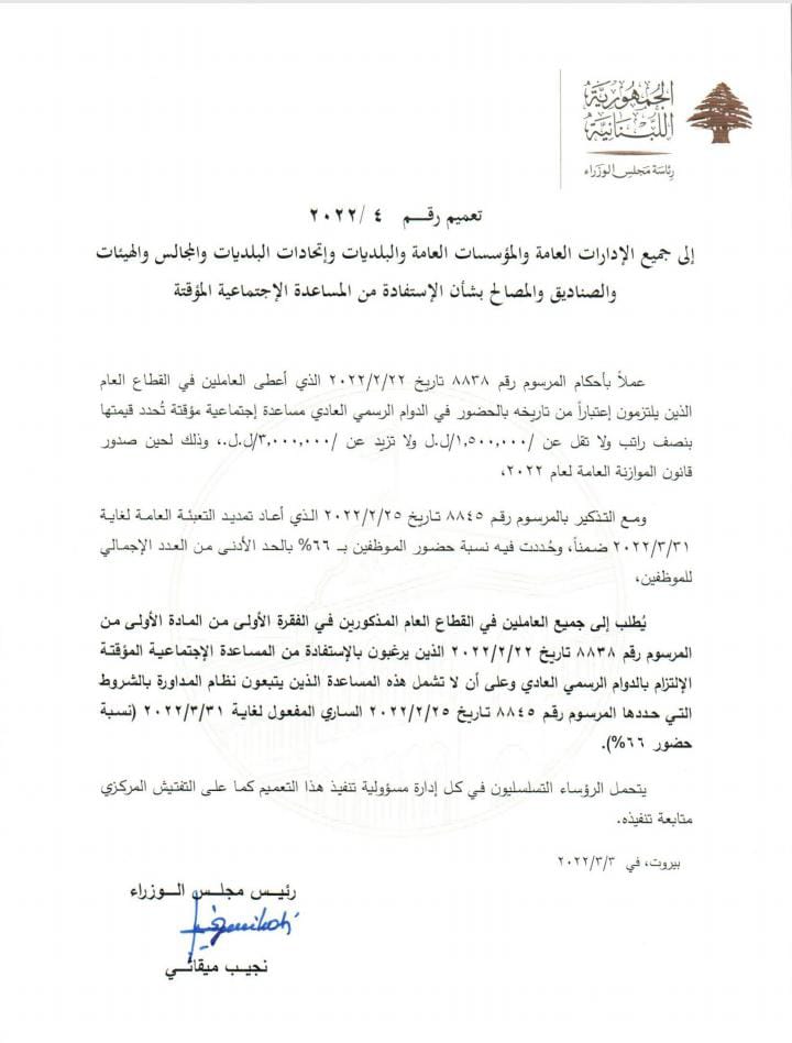 صدر عن رئيس مجلس الوزراء نجيب ميقاتي تعميم متعلق بموضوع المساعدات الاجتماعية المؤقتة التي ستعطى للعاملين في القطاع العام، اليكم تفاصيله.