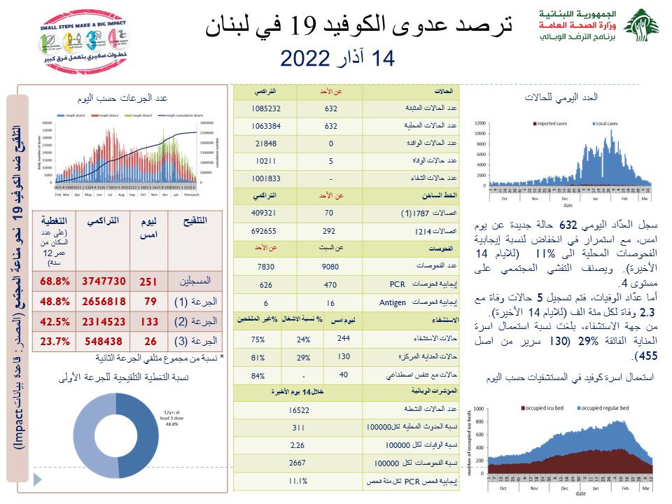 أعلنت وزارة الصحة العامة عن تسجيل 632 إصابة جديدة بفيروس كورونا ليرتفع العدد التراكمي للإصابات منذ بدء انتشار الوباء إلى 1085232.
