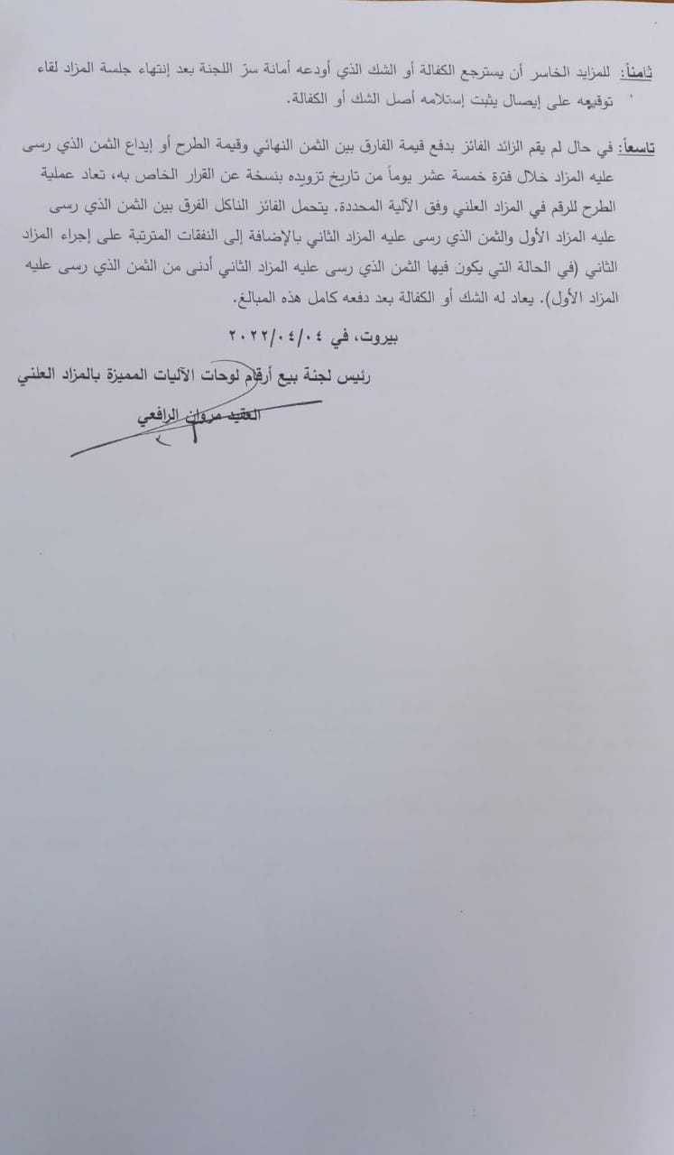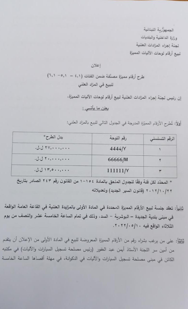 أعلنت هيئة إدارة السير والآليات والمركبات في بيان، أنها ستطرح أرقاماً مميزة للبيع في المزاد العلني.