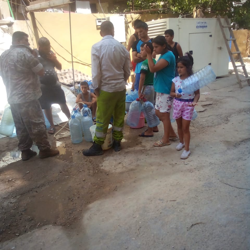 بالاستعانة بنقطة عامة لتوزيع المياه، قريبة من سكنهم لتعبئة "غالونات" المياه بهدف تأمين مياه الشرب الى منازلهم بعد استمرار انقطاع المياه عنها منذ عدة أيام.