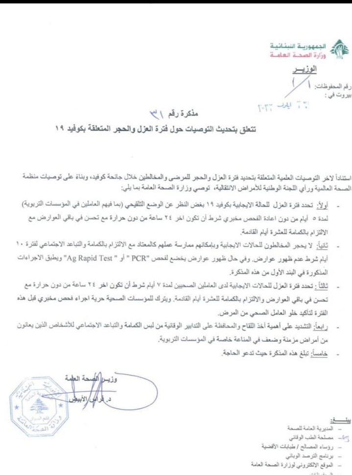 وفي ما يلي صورة لنص المذكرة الصادرة عن وزير الصحّة: