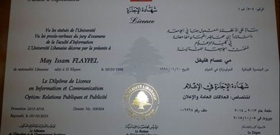 " أنه بعد سنتين من الوعود والتسويف والانتظار، تمَّ إلغاء حفل التخرّج المُقرّر لطلاب كلية الإعلام في الجامعة اللبنانية، وتقرر تسلّيمهم شهادات الإجازة من إدارة الكلية، موقّعة من وزير التربية والتعليم العالي الياس بو صعب ورئيس الجامعة اللبنانية عدنان السيّد حسين وعميد كلية الإعلام جرجس بطرس صدقه. وفي مراجعة معظم هذه الشهادات تبّين أنها احتوت على أخطاء جسيمة، بعضها يتعلّق بتواريخ الميلاد، والبعض الآخر بنوع الاختصاص، أو مكان الولادة، أو الجنسية، أو جملة من الأخطاء في الشهادة ذاتها! وبالإطلاع على الشهادة التي تسلمتها الطالبة مي فليفل، لوحظ أنه جاء فيها أنّها من مواليد الخيام بينما هي من مواليد رأس بيروت، وأنّ الاختصاص علاقات عامّة مع إنّ اختصاصها صحافة، كما حصل خطأ في تاريخ ولادتها وأيضاً رقم ملفّها.