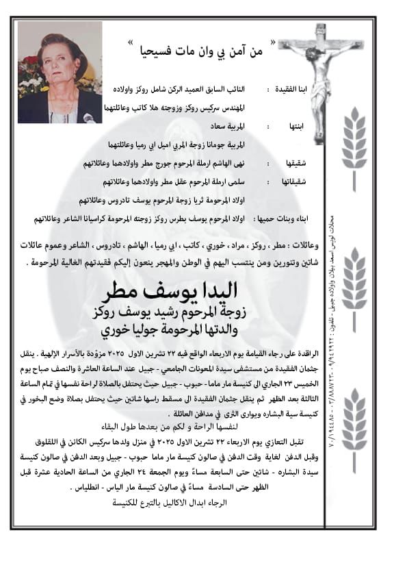 ماما - حبوب - جبيل وبعد الدفن في صالون كنيسة سيدة البشاره - شاتين حتى السابعة مساءً ويوم الجمعة 24 الجاري من الساعة 11 قبل الظهر حتى السادسة مساء في صالون