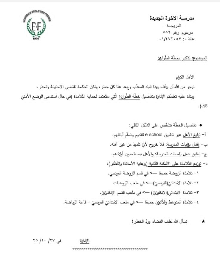 في الضاحية الجنوبية، تذكيراً إلى أهالي التلاميذ، بشأن خطّة الطوارىء التي وضعتها، في حال استدعى الوضع الأمنيّ ذلك.