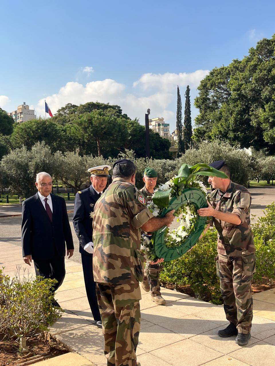 وكان الأميرال كولديفي وضع إكليلاً من الزهر على النصب التذكاري لشهداء القوات الفرنسية في حرم قصر الصنوبر تكريما لذكراهم واكباراً لتضحياتهم، وأديت في المناسبة المراسم التكريمية.