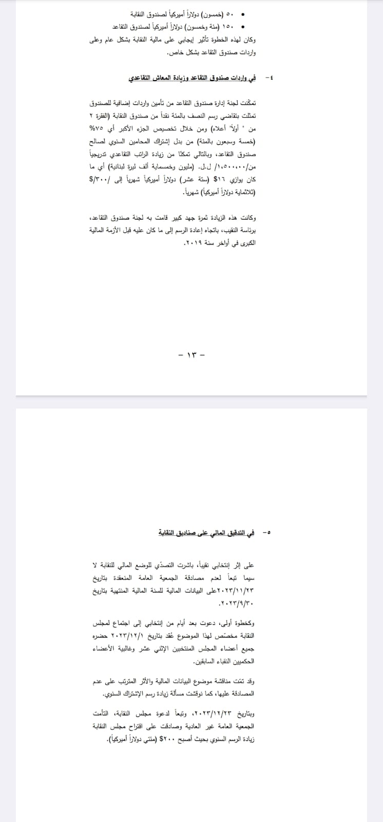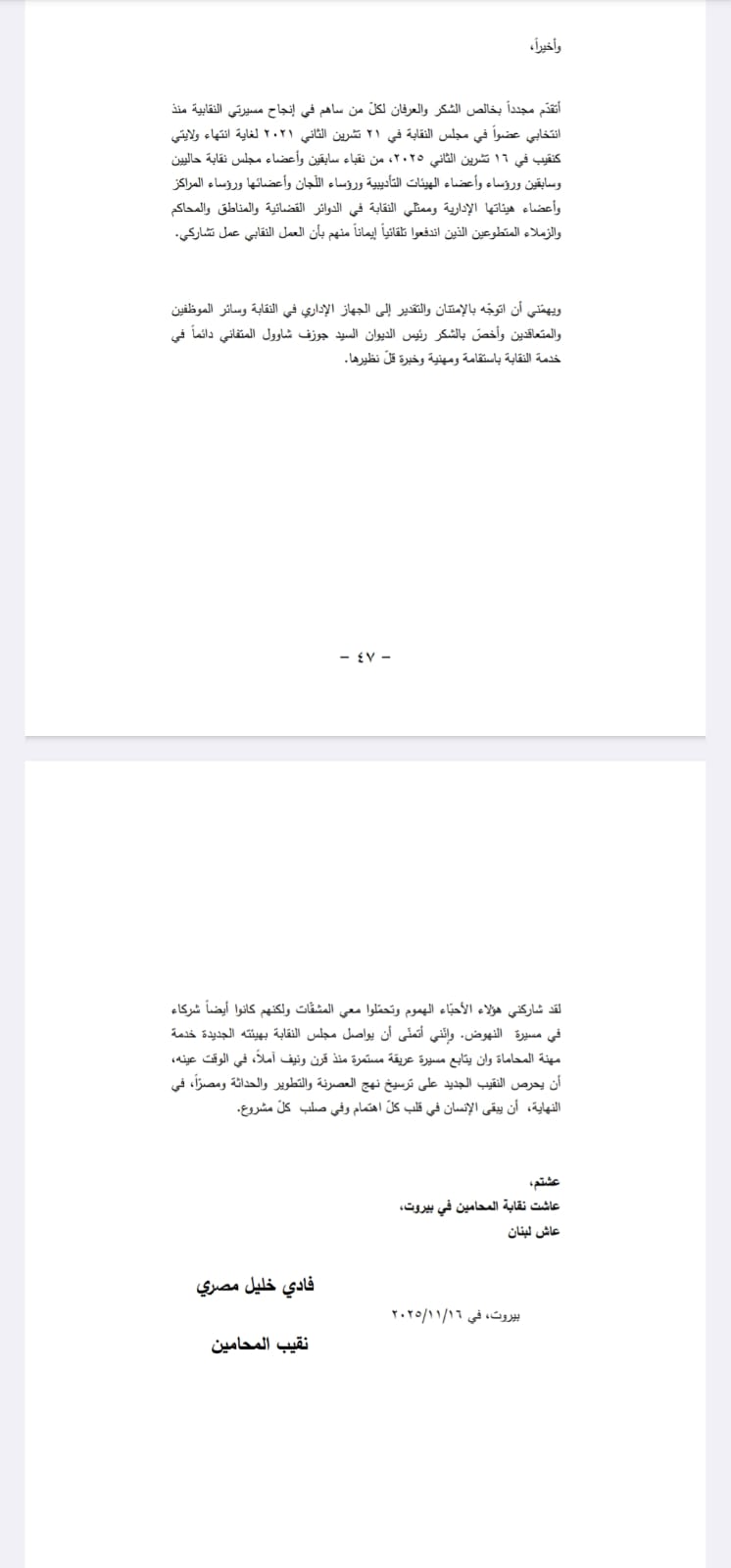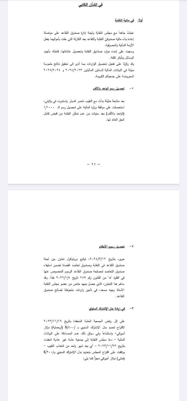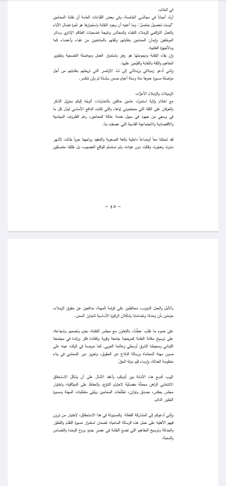 ، في نهاية ولايته، بيانه إلى الجمعية العمومية، المتضمّن عرضًا لعمل النقيب والنقابة على الصعيدين الوطني والنقابي طيلة فترة ولايته.
