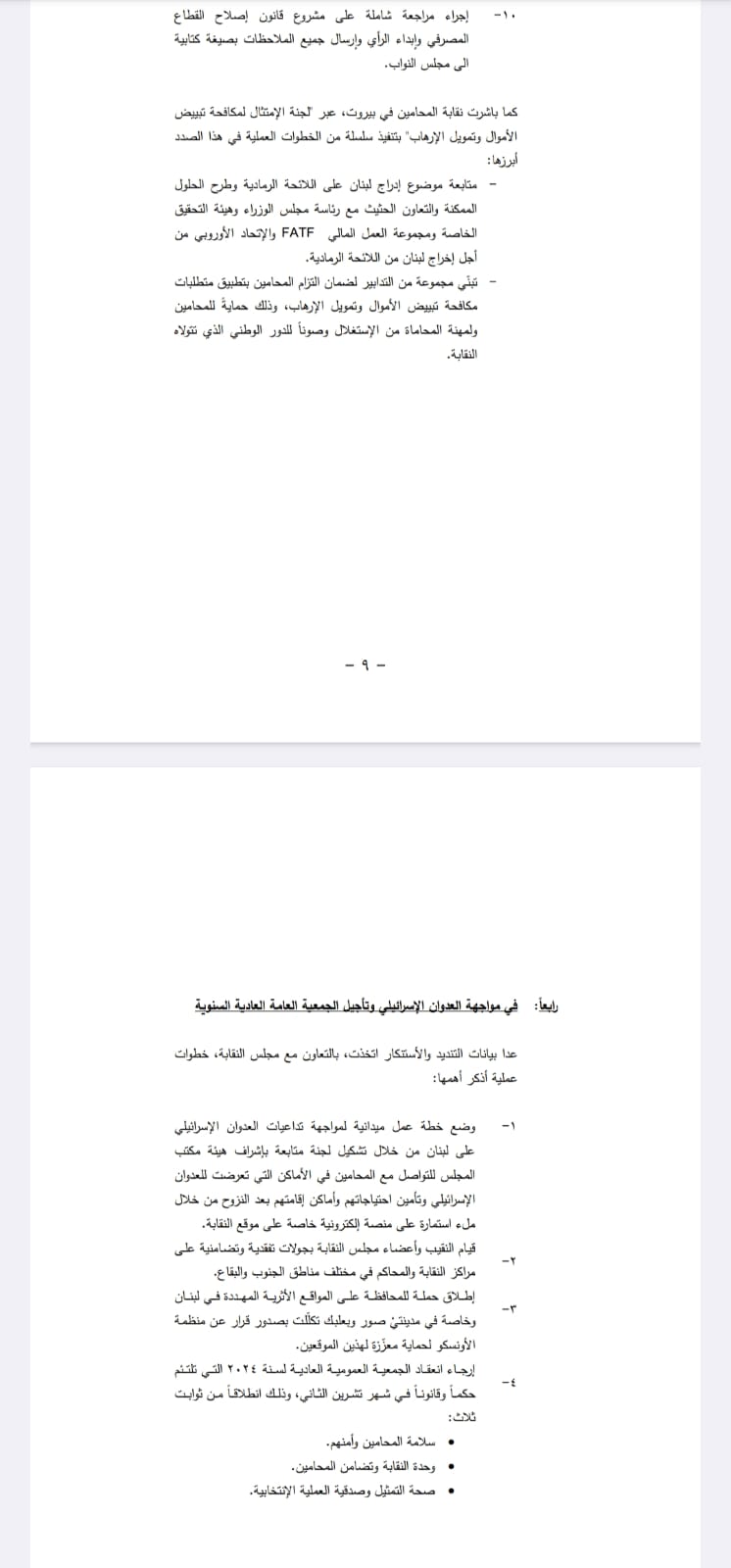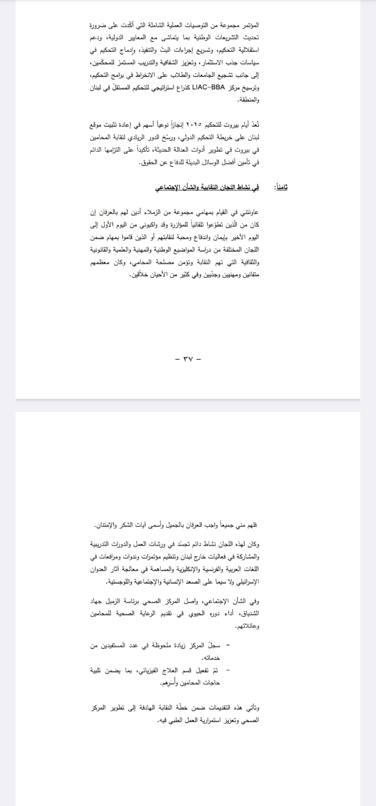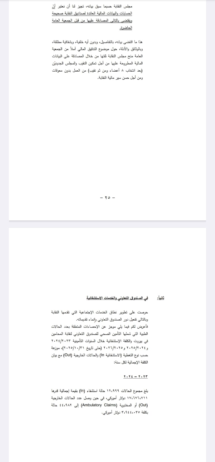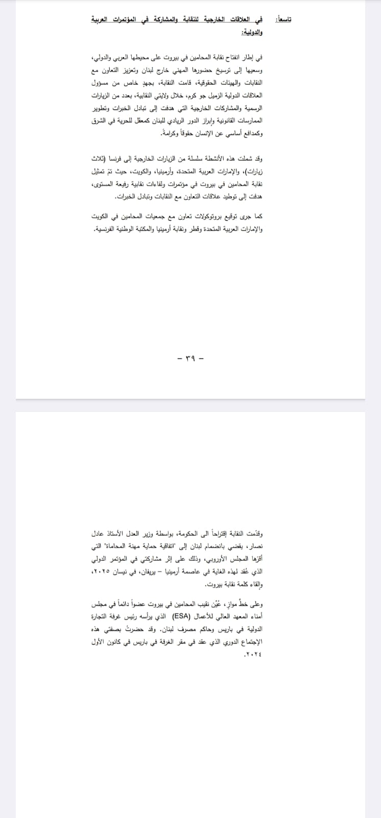 ، في نهاية ولايته، بيانه إلى الجمعية العمومية، المتضمّن عرضًا لعمل النقيب والنقابة على الصعيدين الوطني والنقابي طيلة فترة ولايته.
