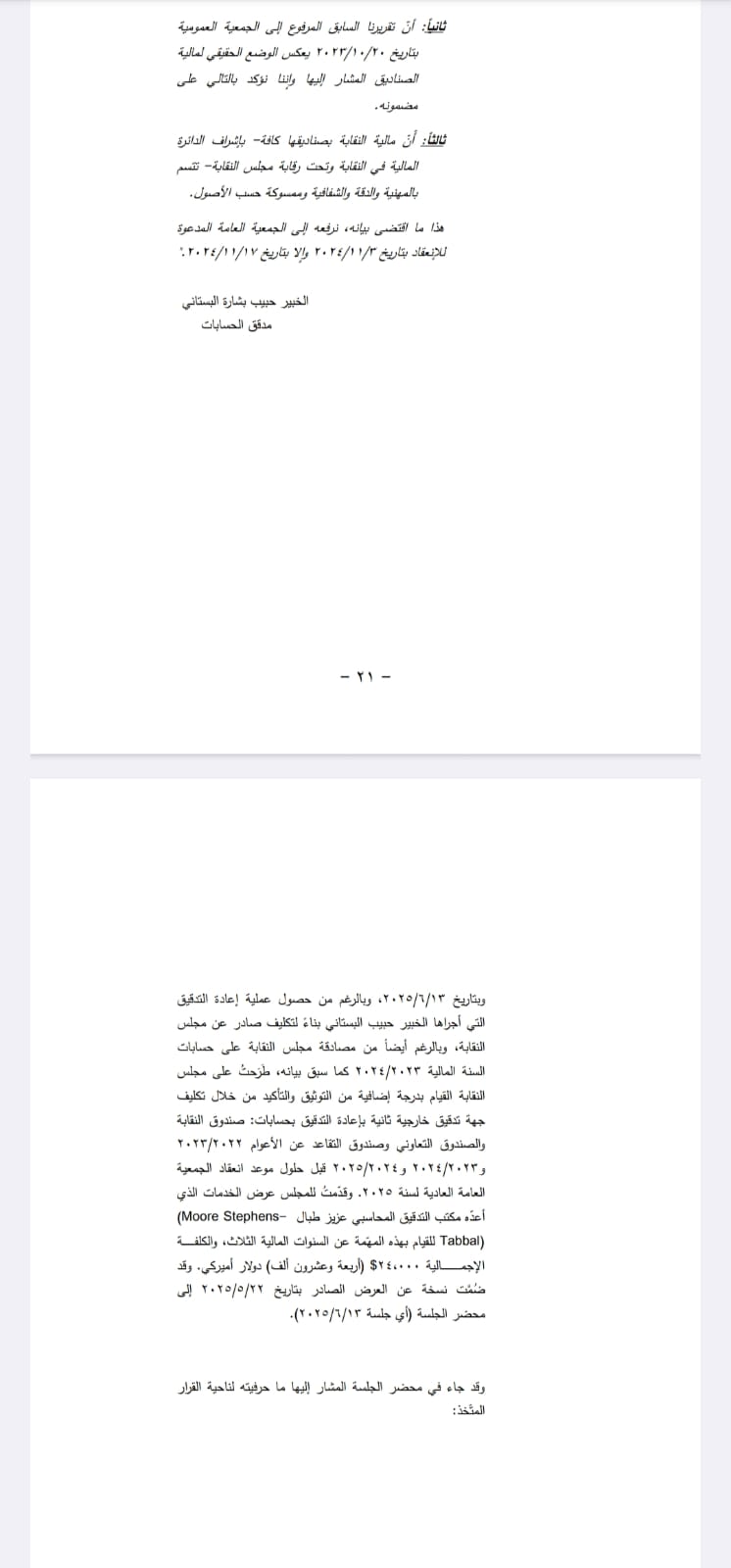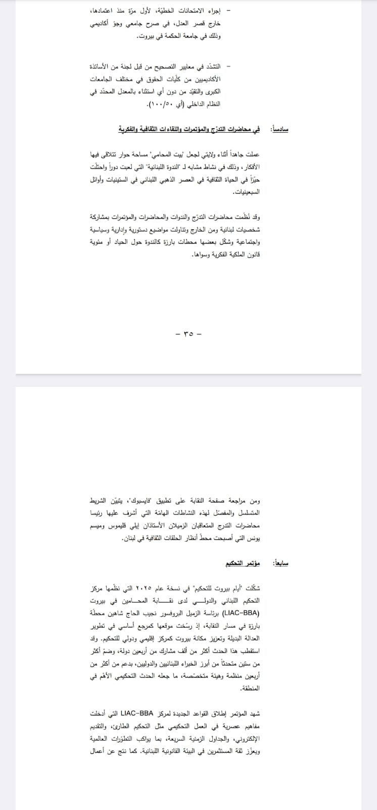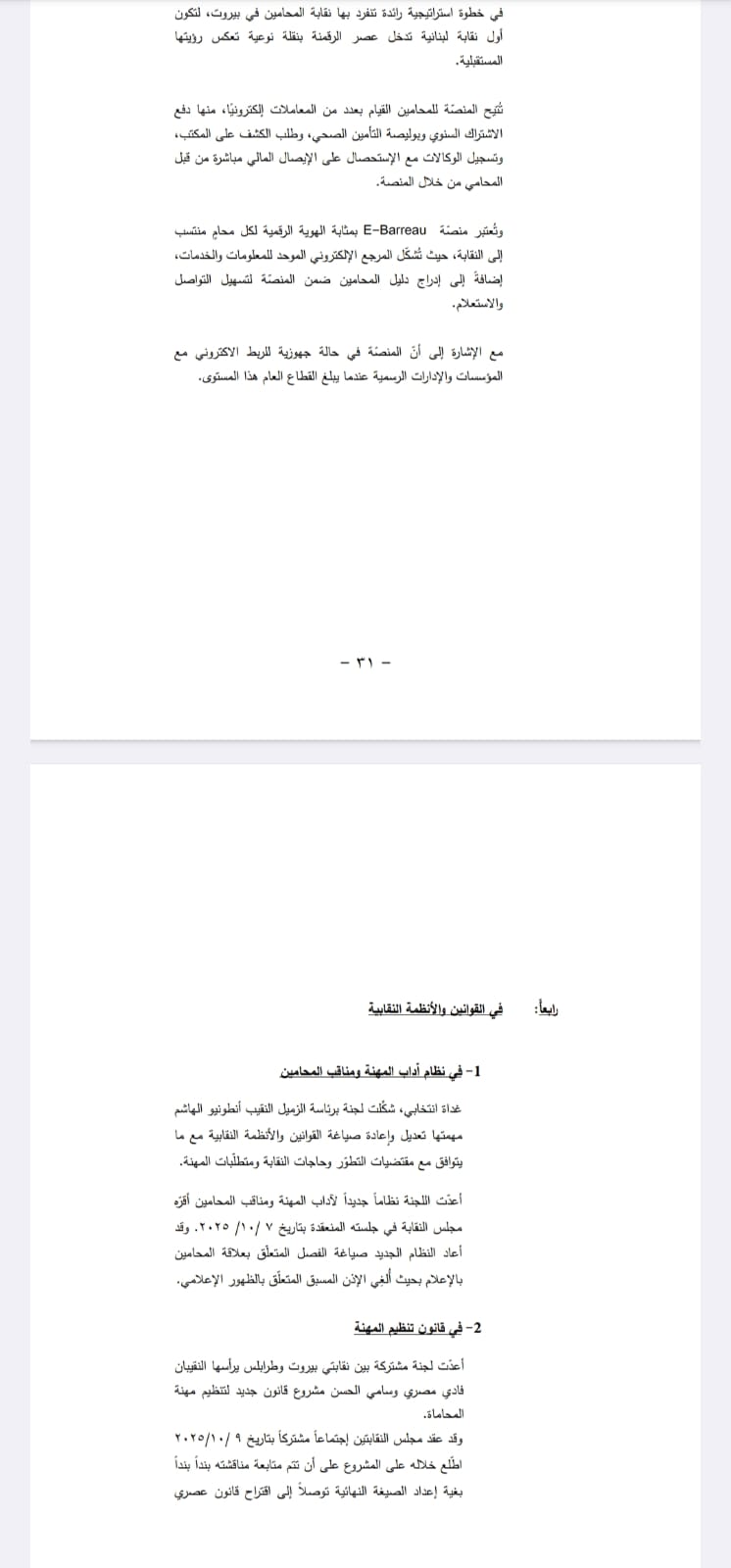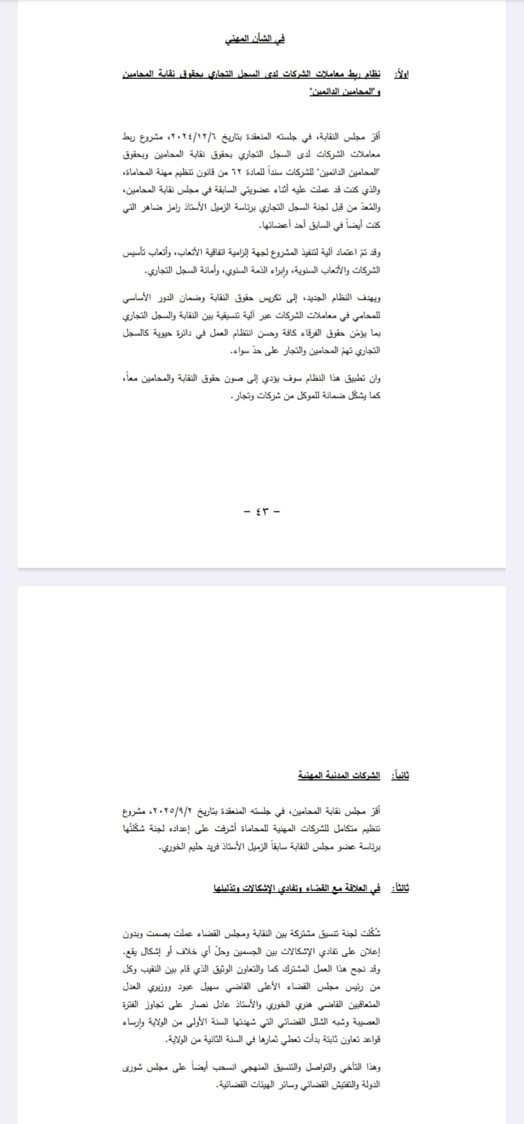 ، في نهاية ولايته، بيانه إلى الجمعية العمومية، المتضمّن عرضًا لعمل النقيب والنقابة على الصعيدين الوطني والنقابي طيلة فترة ولايته.