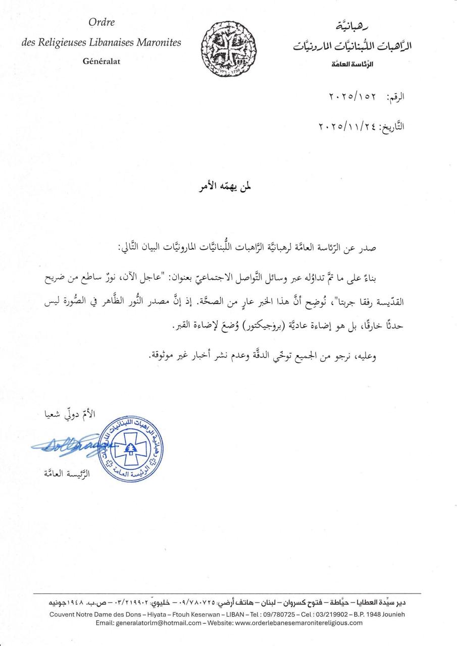 – جربتا، ردًا على الأنباء المتداولة عن ظهور نور من قبر القدّيسة رفقا، أن "ما يتم تداوله غير دقيق"، مؤكدًا أن "النور ناجم عن جهاز بروجيكتور مُثبت في المكان، ولا علاقة له بأي ظاهرة استثنائية".