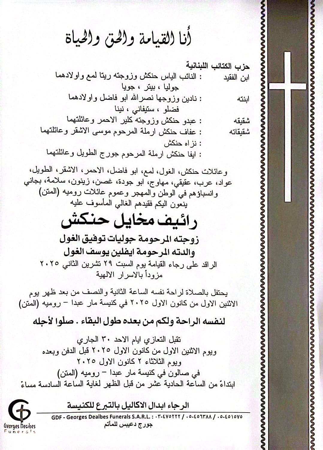 تقبل التعازي أيام الأحد 30 الجاري ويوم الإثنين الأول من كانون الأول 2025 قبل الدفن وبعده ويوم الثلاثاء 2 كانون الأول 2025 في