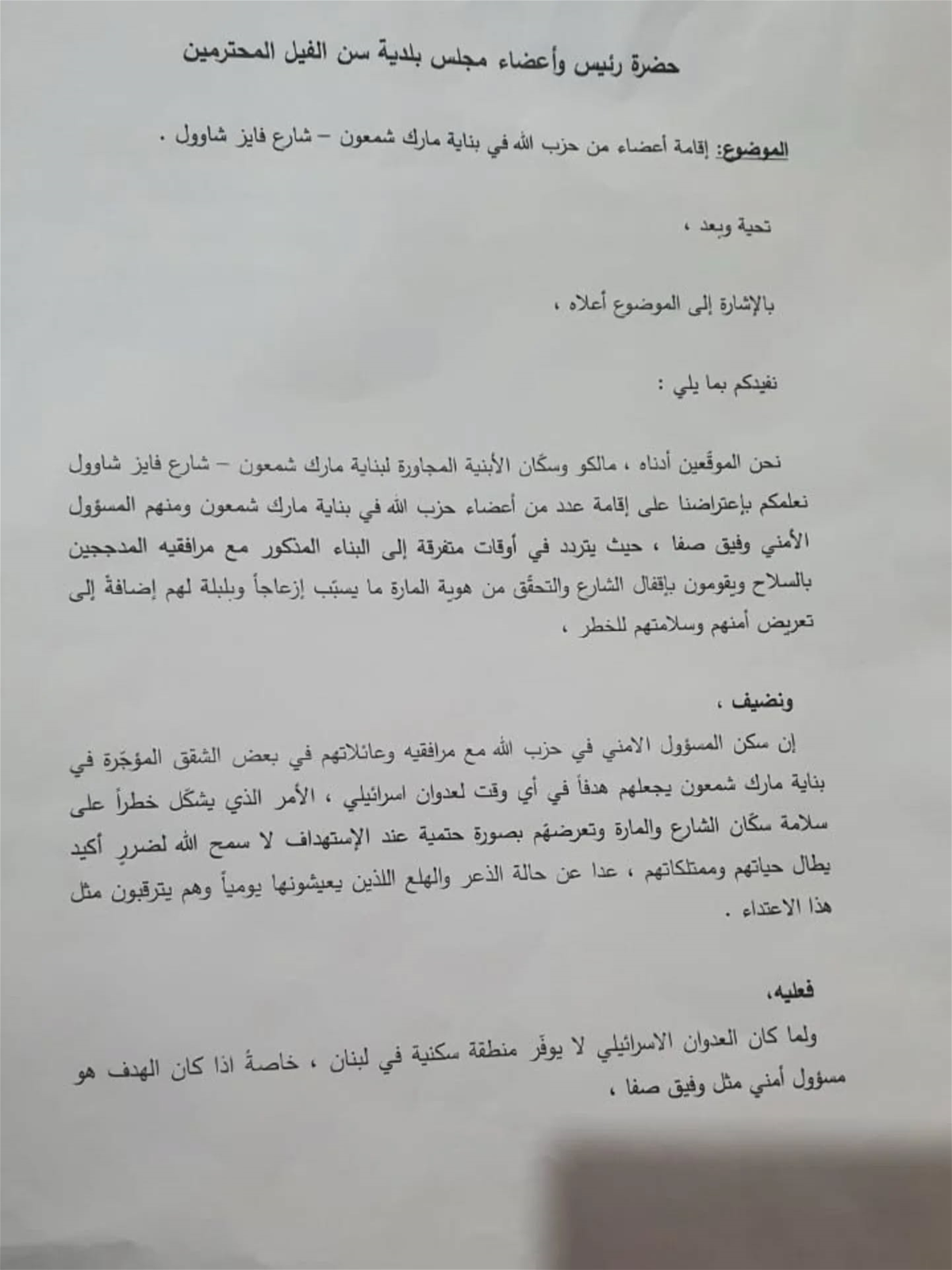 ضجة كبيرة أثيرت خلال الساعات الماضية عقب انتشار صورة لكتاب عبر مواقع التواصل الإجتماعي، وجهه مالكو وسكان الأبنية المجاورة لمبنى مارك شمعون - شارع فايز شاوول إلى بلدية سن الفيل، يفيدُ بأن أعضاء من "حزب الله" يقيمون ضمن المبنى المذكور.