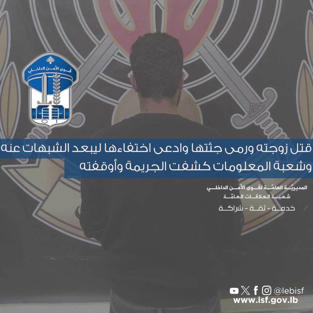 بتاريخ 21-11-2025، وبعد متابعة دقيقة، تمكّنت دوريات الشعبة من توقيفه في بلدة عرمون. بالتحقيق معه، أنكر في البداية أي علاقة بالجريمة، لكن بعد مواجهته بالأدلّة التي تثبت وجوده في موقع رمي الجثة، اعترف أنه بتاريخ 11-11-2025 حصل خلاف عائلي ومشادة كلامية بينه وبين زوجته داخل المنزل، أقدم خلالها على طعنها بالسكين ودفعها أرضًا ثم جرح عنقها حتى تأكد من وفاتها.