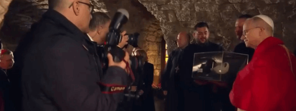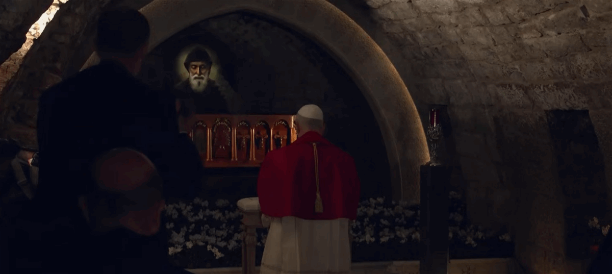 وفي مشهد مليء بالقداسة، جثا البابا لاوون على ركبتيه ليصلي امام ضريح القديس شربل فور وصوله.