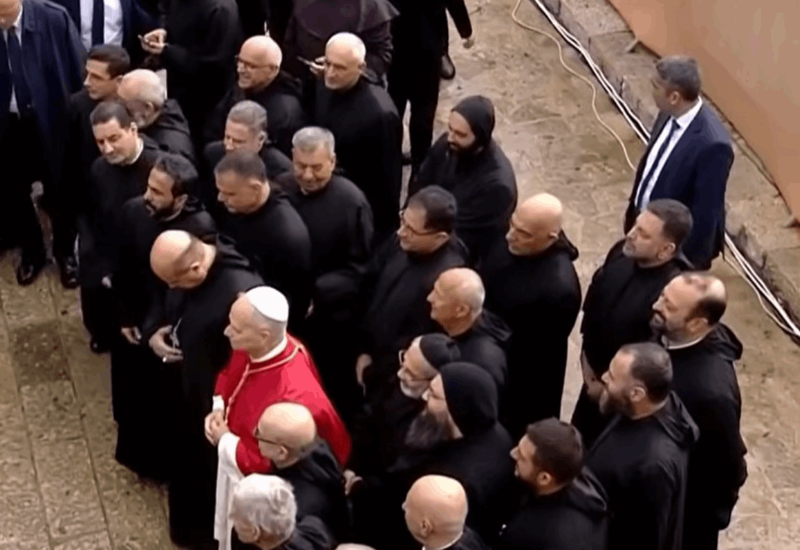 وقبيل مغادرته البابا دير مار مارون عنايا- ضريح القديس شربل متجهاً نحو  مزار سيدة لبنان في حريصا، التقط البابا لاوون الرابع عشر صورا تذكارية مع الكهنة في الدير بعدما  قام بجولة داخل أرجائه حيث كان يحيي ويبارك ويصافح المؤمنين المتجمهرين في مختلف زواياه لنيل البركة والسلام.