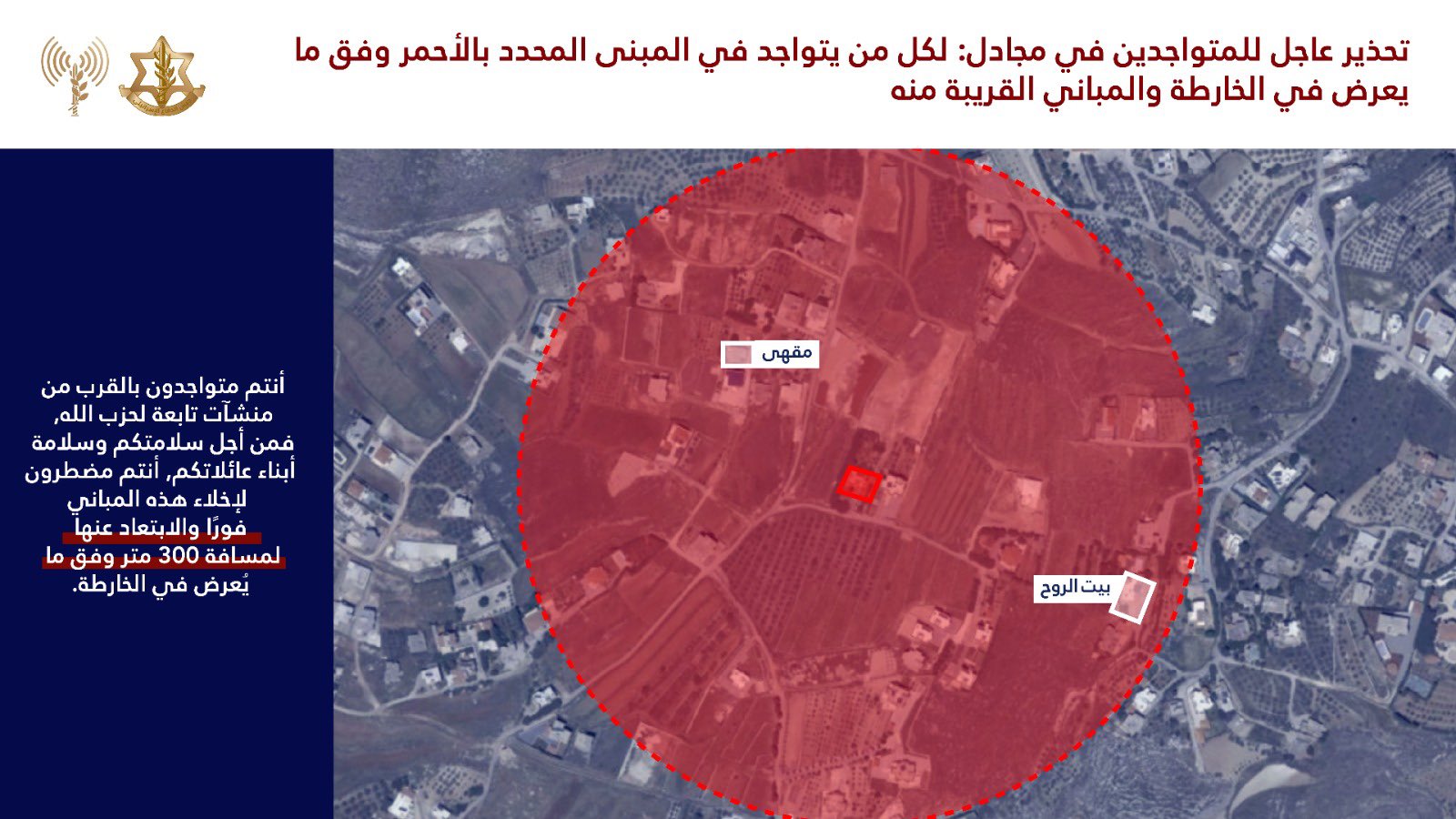 سكان المباني المحددة بالأحمر في الخرائط المرفقة والمباني المجاورة لها في القريتيْن التاليتيْن مجادل وبرعشيت، بوجوب الإخلاء.