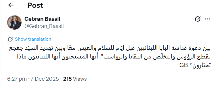عبر حسابه على موقع اكس: بين دعوة قداسة البابا اللبنانيين قبل ايّام للسلام والعيش معًا وبين تهديد السيّد