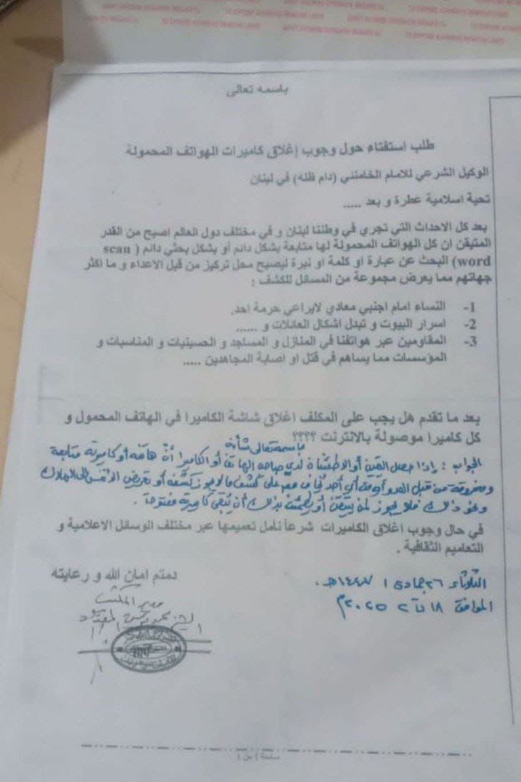وتظهر الوثيقة مكتوبة بخط رسمي، ومذيّلة بتوقيع وختم المكتب بتاريخ ١٨ تشرين الثاني ٢٠٢٥، وتتطرق إلى مخاوف أمنية وأخلاقية جدية ناتجة عن أن الهواتف تخضع لمتابعة وبحث دائم (Scan) من قبل "الأعداء".
