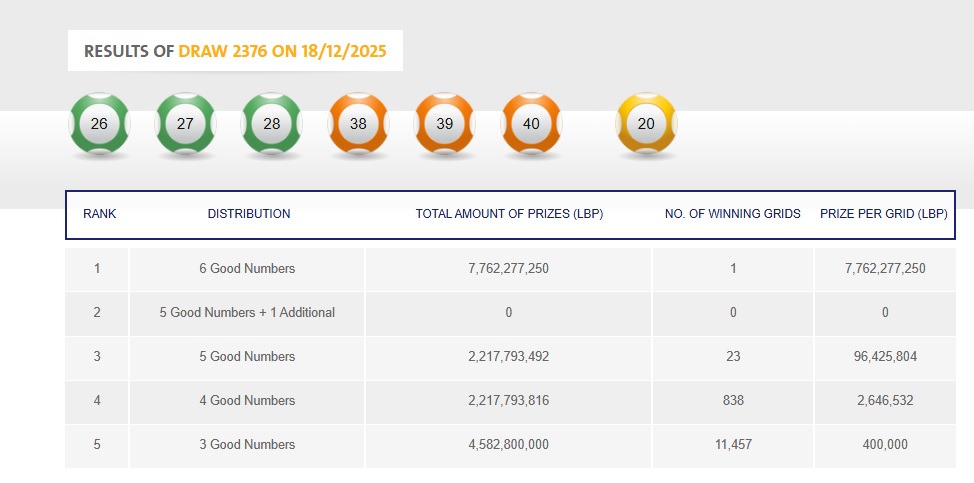 وأتت الأرقام الرابحة على الشكل التالي: 26 - 27 - 28 - 38 - 39 - 40، والرقم الإضافيّ 20.