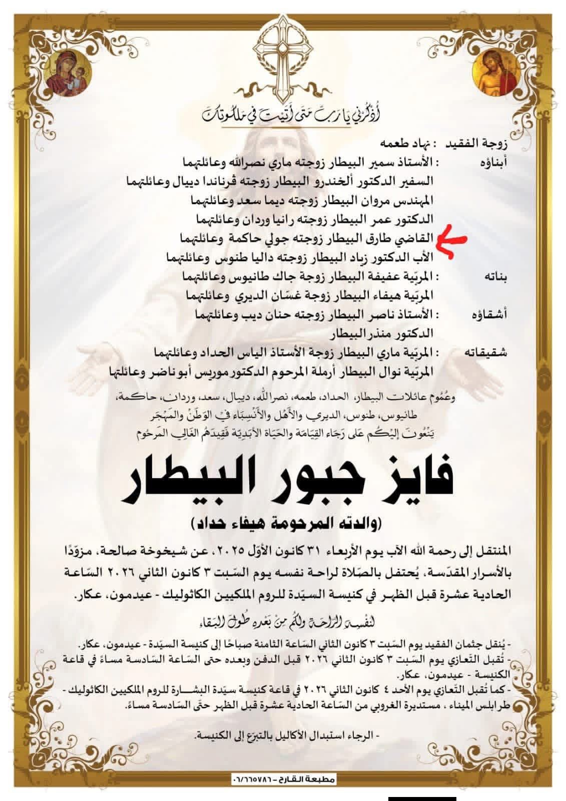 ويُحتفل بالصلاة لراحة نفسه يوم السبت في 3 كانون الثاني 2026، عند الساعة 11:00 قبل الظهر، في