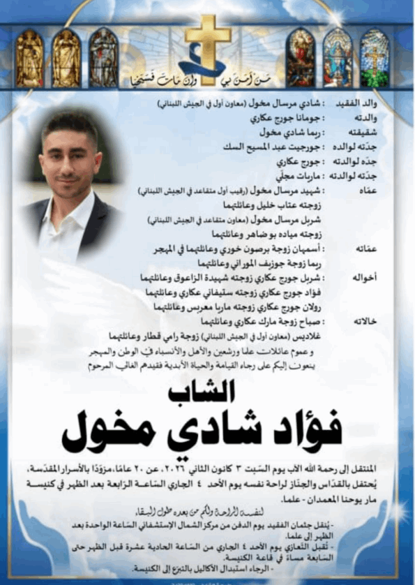 لقي الشاب "فؤاد مخول" في العقد الثاني من عمره مصرعه متأثرًا بجروح بالغة أُصيب بها جراء سقوطه من مرتفع صخري في بلدة إهدن، على الطريق العام بالقرب من جبل السنّ أثناء ممارسته رياضة المشي مع عدد من رفاقه، حسب مندوبة "لبنان24".