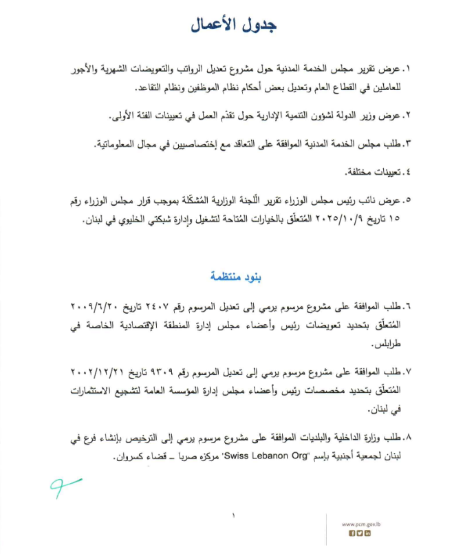 جلسة يوم الخميس الواقع فيه 15-1-2026، في السراي، حيث سيبحث عددا من المواضيع.