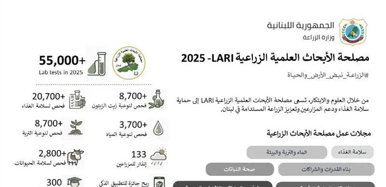 أعلنت مصلحة الأبحاث العلمية الزراعية (LARI) التابعة لوزارة الزراعة اللبنانية، في بيان، أنه "في إطار التزامها المتواصل حماية سلامة الغذاء وتعزيز الزراعة المستدامة في لبنان، عن إنجاز أكثر من 55,000 فحص مخبري خلال عام 2025، في خطوة تعكس دورها المحوري في دعم المزارعين، وحماية الموارد الطبيعية، وصون الصحة العامة.