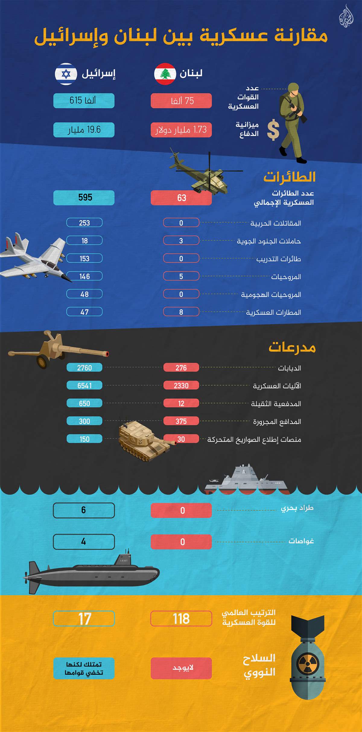 نشرت قناة "الجزيرة" تقريراً رصدت فيه القدرات العسكرية للجمهورية اللبنانية في مقابل قوة جيش الاحتلال الإسرائيلي، وذلك نقلاً موقع "غلوبال فاير باور".