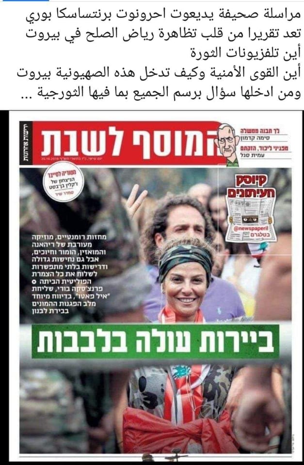 في 25 تشرين الأول الفائت، أي بعد أيام على اندلاع الانتفاضة الشعبية، نشرت صحيفة "يديعوت" الاسرائيلية تقريراً حول الانتفاضة في لبنان، مرفقة التقرير بصورة لشابة من احدى المظاهرات.