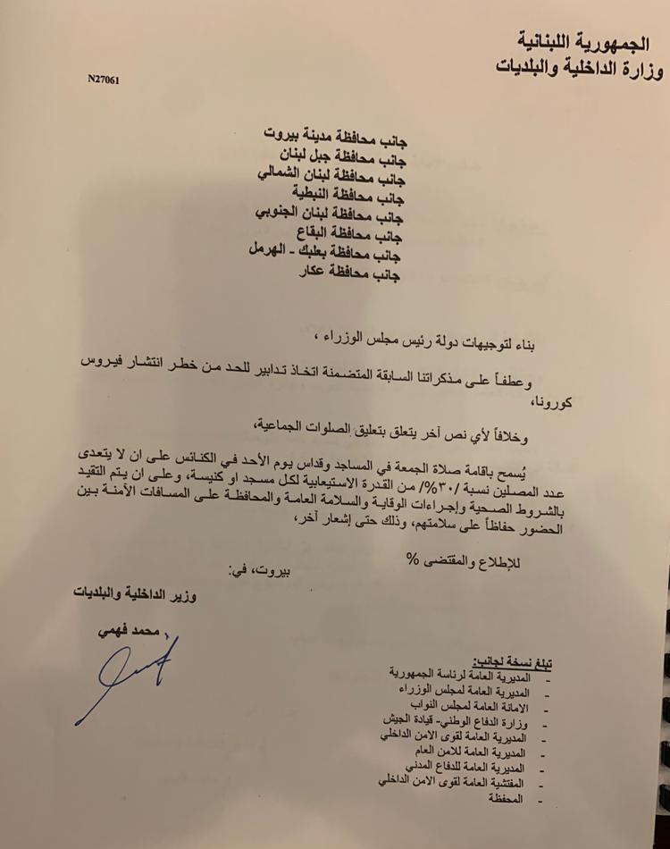 أصدر وزير الداخلية والبلديات، العميد محمد فهمي، مذكّرة تسمح بإقامة صلاة الجمعة في المساجد وقداس الأحد في الكنائس، على ألا تتعدّى القدرة الاستيعابية 30% لكل مسجد أو كنيسة، وأن يتمّ التقيّد بالشروط الصحية وبإجراءات السلامة العامة.