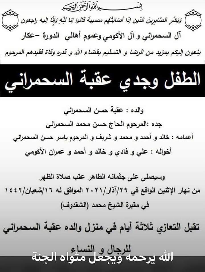 وكان الطفل نقل أمس إلى مستشفى "السلام" في القبيات - عكّار بوضع حرج، وتوفي اليوم متأثراً بإصابته.