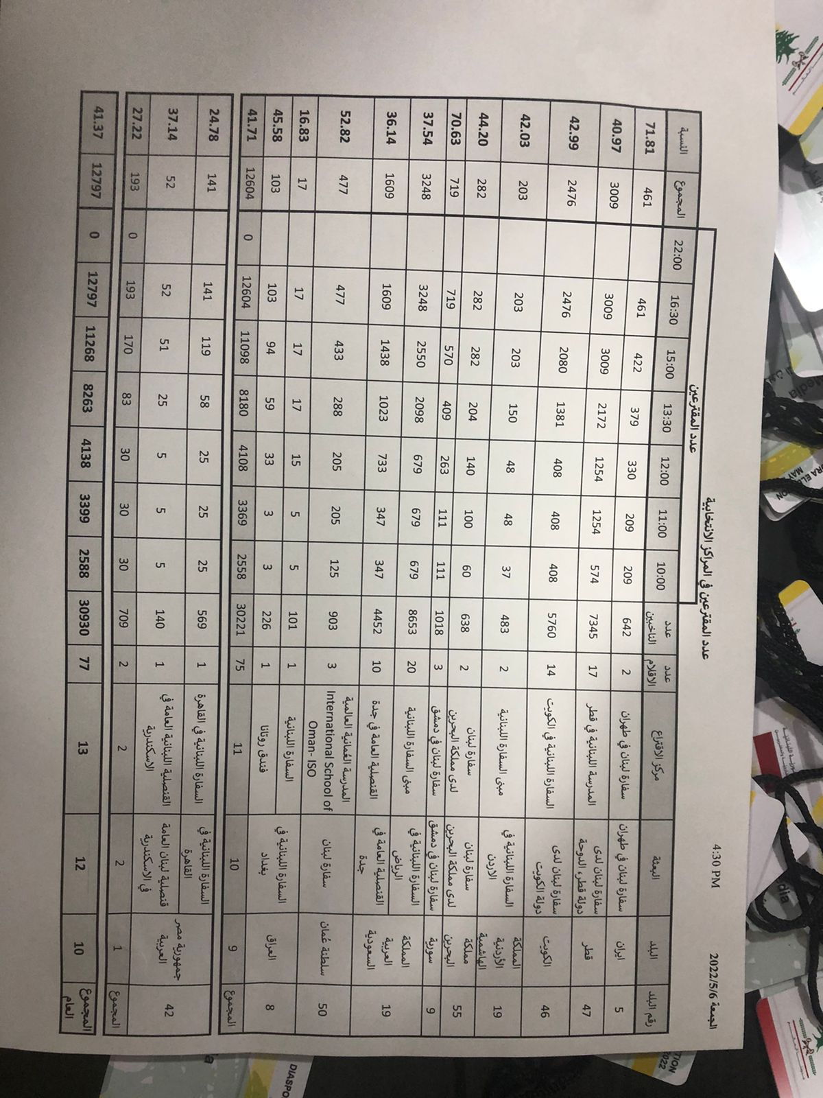 أن نسبة الاقتراع في الدول الاسلامية والعربية التي تجري فيها انتخابات المغتربين اللبنانيين اليوم وصلت الى 41.37% كمعدل وسطي.