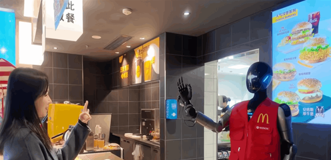 وأظهر مقطع فيديو متداول على منصة "إكس" عدداً من هذه الروبوتات وهي تقف خلف طاولة الخدمة في فرع بمدينة شنغهاي، مرتدية الزي الأحمر والأصفر الخاص بالسلسلة، وتؤدي مهام اعتاد العاملون القيام بها، من الترحيب بالزبائن إلى المساعدة وتسليم الطلبات.