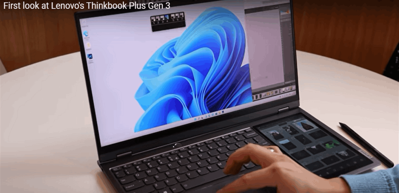 وأكثر ما يميز حاسب ThinkBook Plus Gen 3 هو حصوله على شاشة إضافية مثبتة بجانب لوحة المفاتيح، يمكن للمستخدم الكتابة والرسم عليها بقلم ذكي لتعديل الصور أو إضافة توقيعه على الوثائق الإلكترونية.
