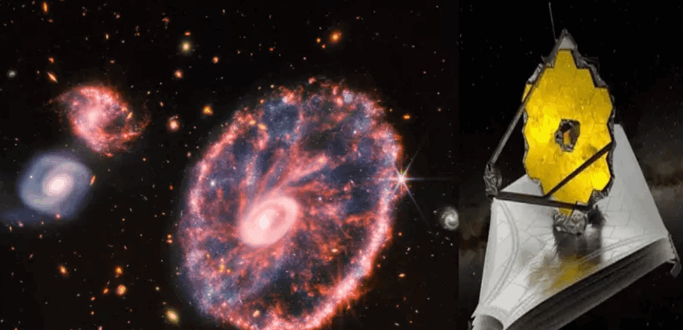 اكتسبت مجرة "عجلة العربة" المعروفة باسم Cartwheel انجليزيا، شكلها الغريب بعد اصطدام مذهل بين مجرتين، وفق ما قالت وكالة NASA في موقعها الذي نشرت فيه أمس الثلاثاء صورة جديدة التقطها تلسكوب "جيمس ويب" الفضائي للمجرة الواقعة في "كوكبة النحات" حيث نتج عن اصطدام المجرتين حلقتان تتوسعان من مركز المجرة "كتموجات ناتجة عن إلقاء حجر في بركة" فظلت الحلقة البيضاء الأصغر أقرب إلى مركز المجرة، بينما راحت الحلقة الخارجية بأضلاعها الملونة تتوسع في الكون منذ 440 مليون عام.