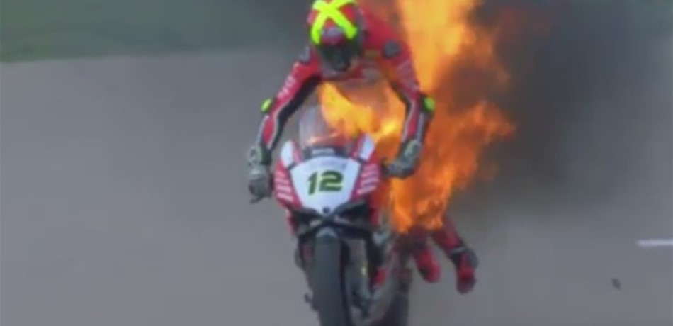 بالفيديو.. متسابق ينجو من الموت بعد اشتعال دراجته