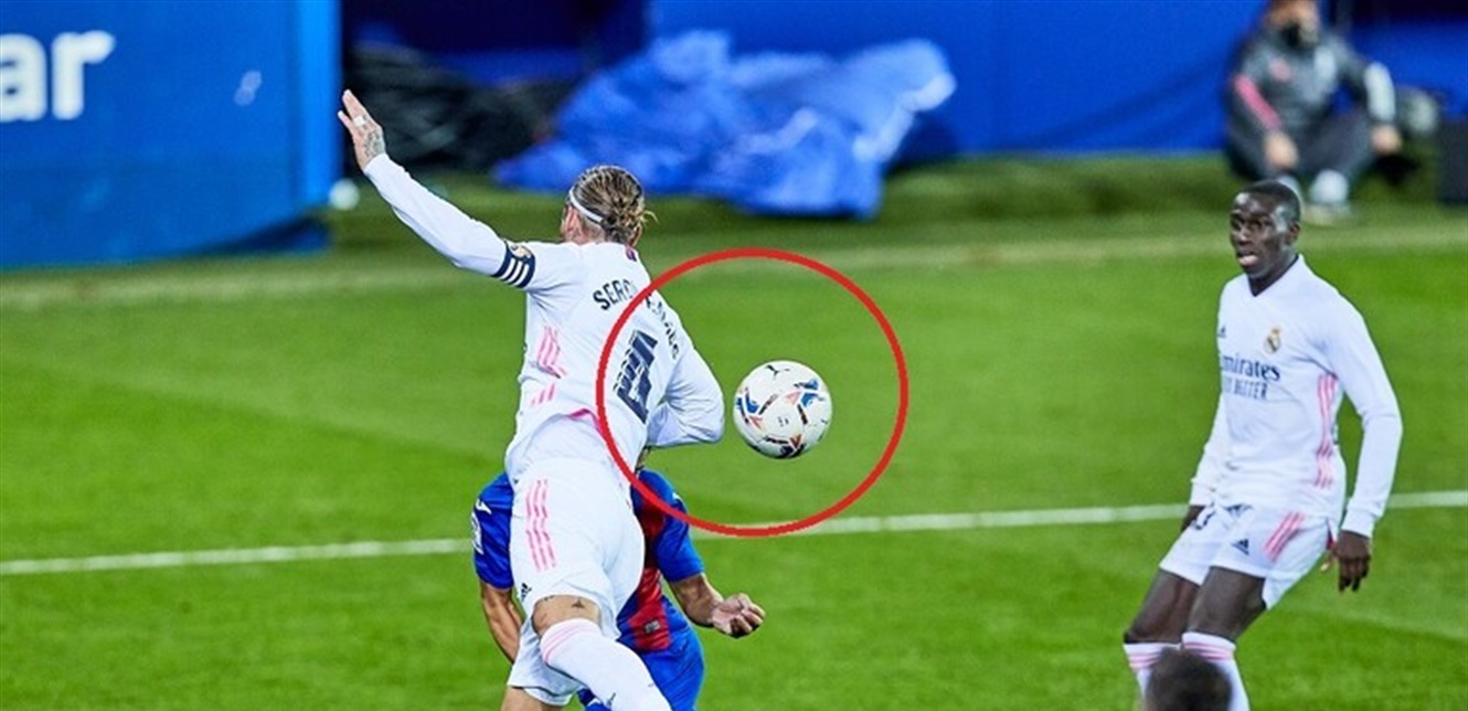 ايبار وريال مدريد الدقيقة 81 قرار خاطىء بعدم احتساب ركلة جزاء على راموس للمس الكرة باليد عندما ارتقى راموس للعب الكرة برأسه فتجاوزته إلى موتو الذي أعاد الكرة بالرأس من مسافة قريبة فلمست ساعد راموس وهذا بالغالب لايعتبر خطأ لكنه أصبح خطأ بتحرك راموس لساعده بعيدا لمنع مرور الكرة pic.twitter.com/O866Azf1bH — جمال الشريف (@RefereeJSharif) December 21, 2020