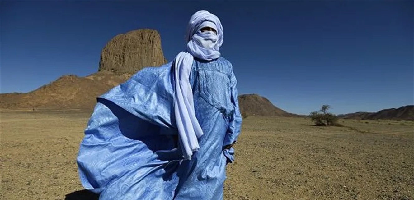 يرتدي الطوارق الذين يعيشون في الصحراء جلابيبهم الزرقاء واللثام ويجوبون أطرافها من