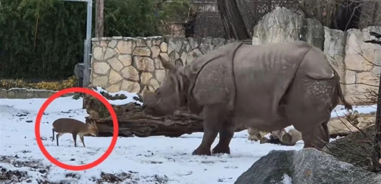 ، حيث ظهر غزال صغير من نوع المونتجاك الصيني وهو يتحدى وحيد قرن ضخم يزن 1.7 طن.