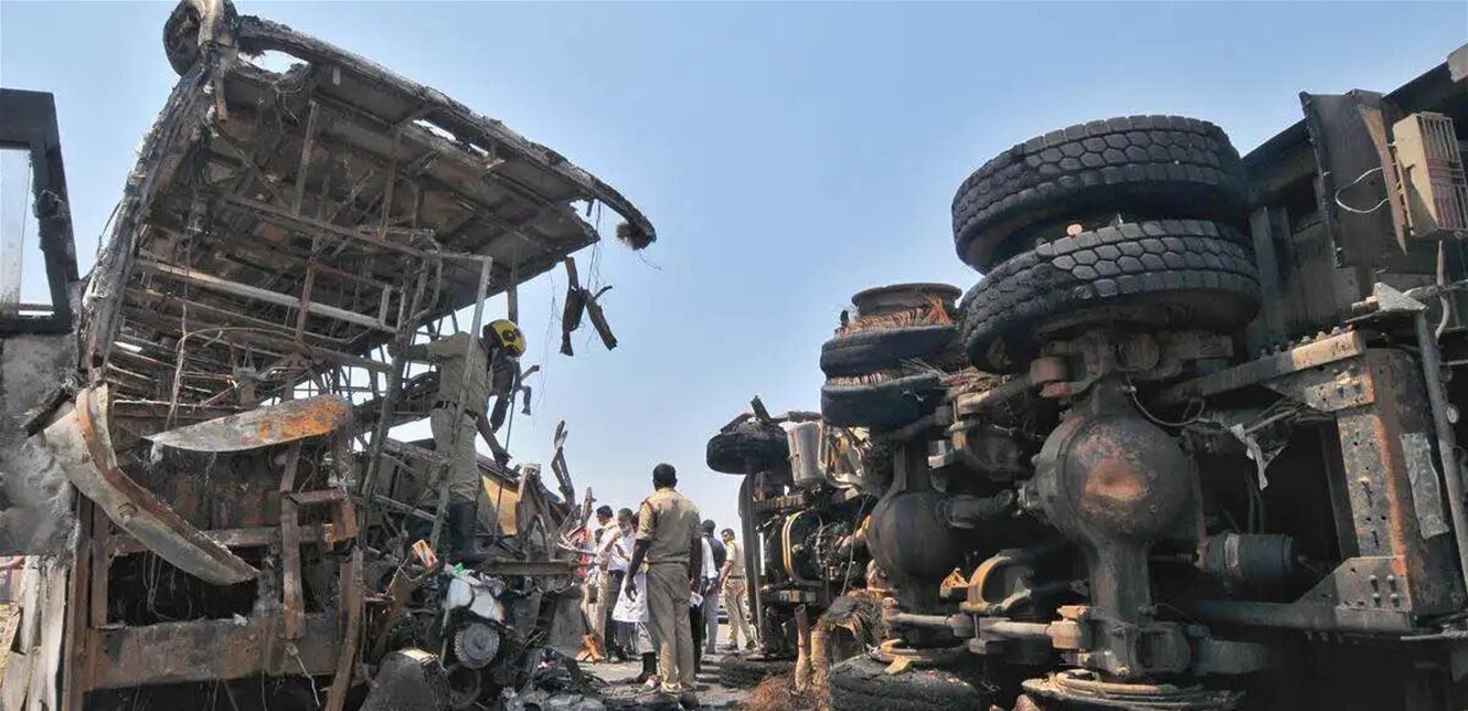 الهند، أعقبه اندلاع حريق داخل الحافلة، ما أدى إلى وفاة عدد من الركاب حرقًا.