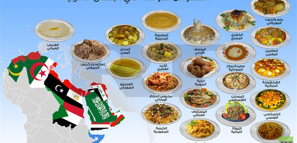 نشرت وكالة روسيا اليوم انفوغراف يظهر أشهر المأكولات في العالم العربي. إليكم أبرزها: - التبولة في لبنان. - الكبسة في السعودية. - الكبة في سوريا. - الكشري في مصر. - المنسف في الأردن. - الكسكسي في تونس.