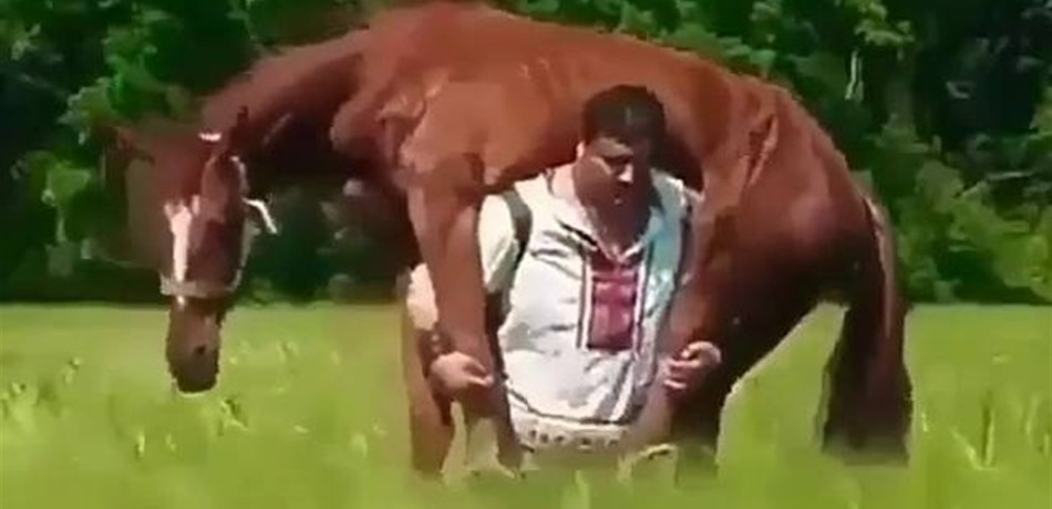 انتشر على مواقع التواصل الاجتماعي مقطع فيديو يظهر قيام رجل بحملِ حصانٍ على كتفه.