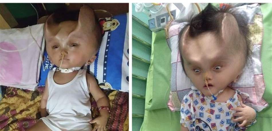 وعندما تم نقل الطفل إلى المستشفى لإجراء جراحة عاجلة تسبب شفط السوائل في بروز عظام الجبهة فظهر الطفل وكأن له "قرنين".