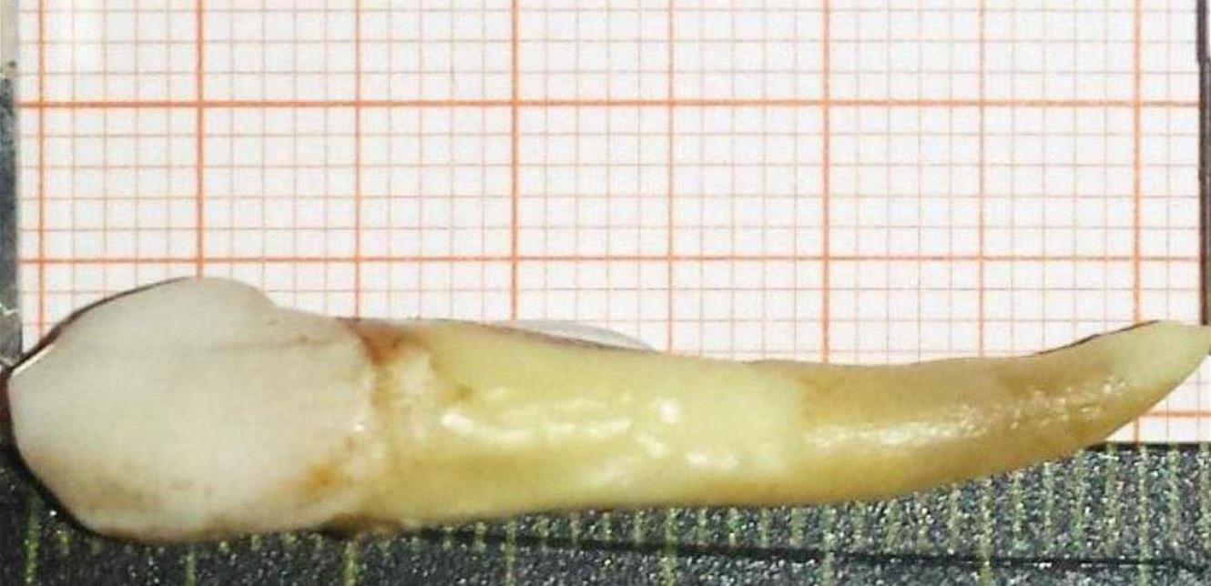 ورغم أنّ الجزء البارز من السن بدا عادياً وليس ضخماً، فإنّه كان يخفي جذراً عميقا تحت خط اللثة.