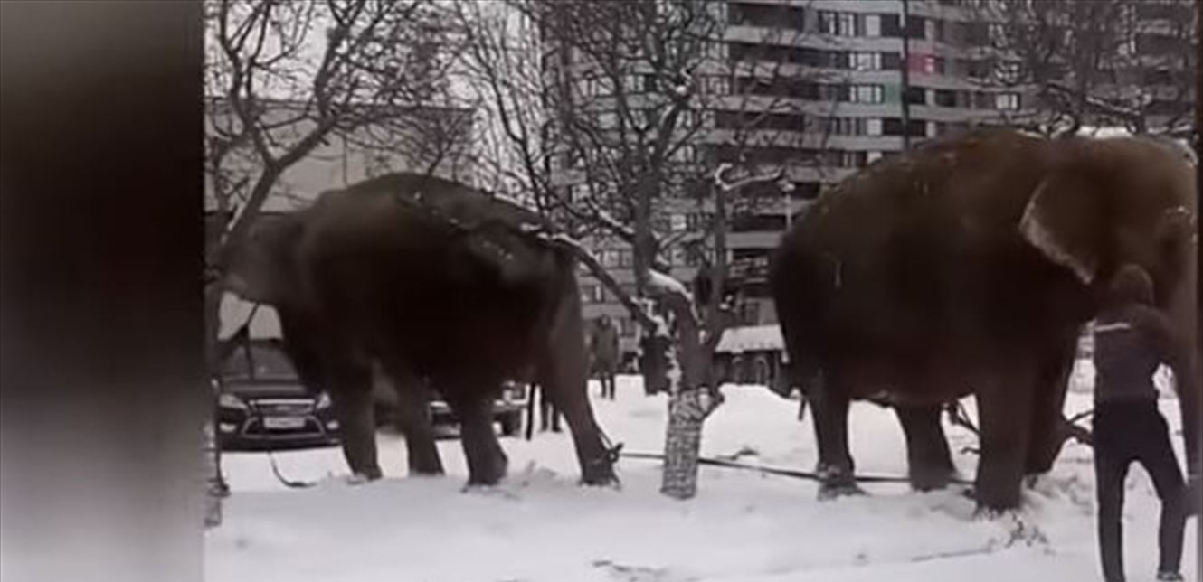 تفاجأ سكّان مدينة يكاترينبورغ الروسية، يوم 23 كانون الثاني، بظهور زوجٍ من الفيلة وسط المدينة الثلجية.