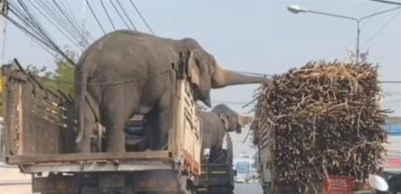 وبحسب فيديو انتشر على مواقع التواصل فإنّ فيلَيْن محمولين في شاحنتين منفصلتين على طريق في منطقة ناخون سوان، شمالي البلاد، التهما بعضاً من قصب السكر من عربتَيْن مجاورتَيْن، أثناء توقف السير على إشارة مرور.