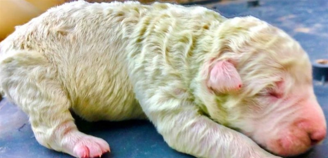 وبحسب شبكة "بي بي سي" البريطانية، يعتقد أنّ الجرو الصغير اكتسب هذا اللون بسبب صبغية يطلق عليها اسم "بيليفيردين" والتي تتشكّل أثناء وجوده في الرحم.